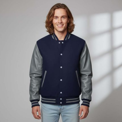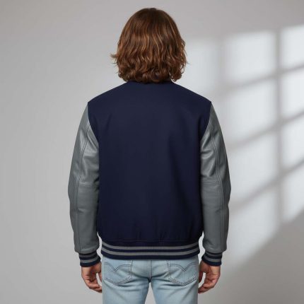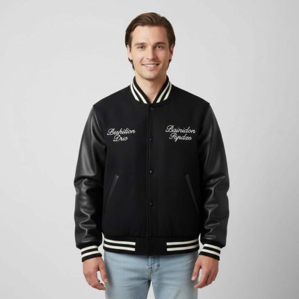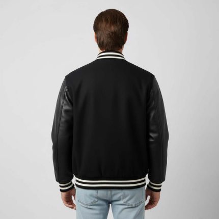 Black Wool Body and Cowhide Leather Sleeve Varsity Jacket