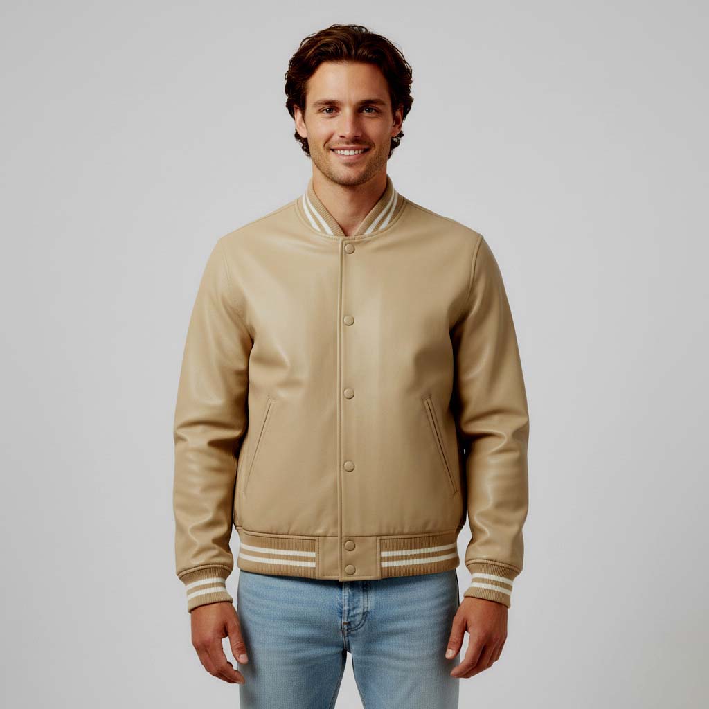 Step up your fashion game with this Beige Varsity Jacket, designed for both comfort and style. Featuring a sleek minimal look, it comes with a snap-button closure, ribbed striped collar, cuffs, and hem that add a sporty edge to your outfit. The jacket is made from high-quality, durable fabric with a soft inner lining to keep you warm and comfortable in all seasons.