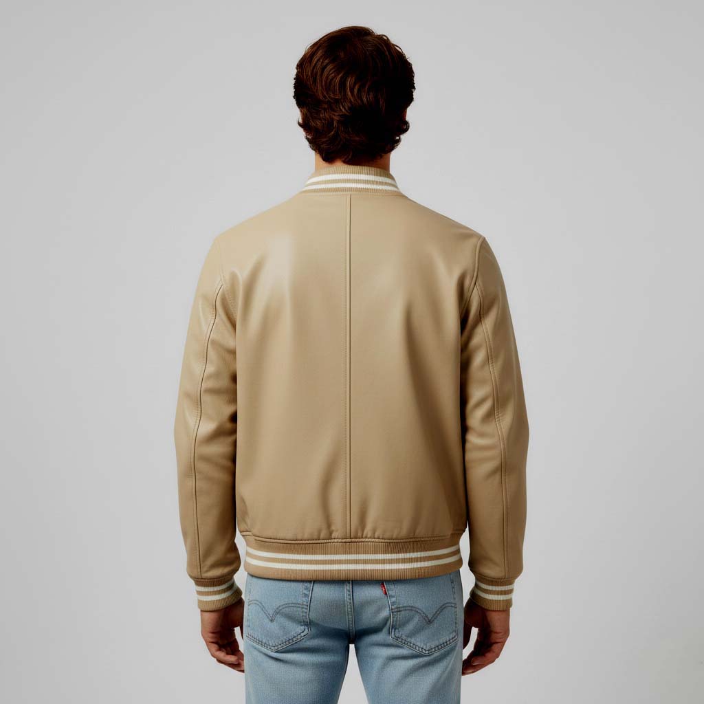 Two slanted side pockets offer both functionality and flair, making it ideal for keeping essentials close at hand. Its neutral beige color makes it versatile, allowing you to pair it effortlessly with jeans, chinos, or joggers. Whether you’re heading out for a casual day, layering up for chilly evenings, or adding a retro-inspired touch to your streetwear, this varsity jacket is the perfect wardrobe essential.