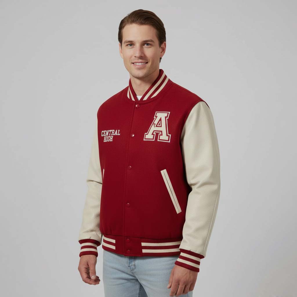 Celebrate tradition and team pride with this red and white varsity jacket—a timeless letterman piece that captures the essence of high school spirit. The vibrant red wool body is paired with crisp white leather sleeves, creating a bold two-tone look that’s instantly recognizable and endlessly stylish.