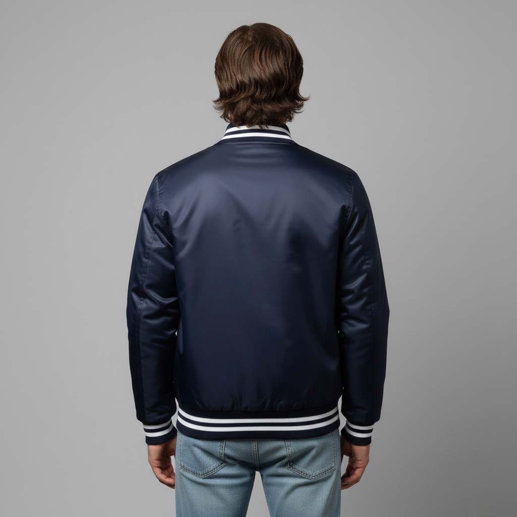 Step into effortless cool with this navy blue varsity jacket, crafted from a smooth satin-like fabric that adds a modern sheen to a timeless silhouette. The crisp white accents—including six snap buttons, pocket trims, and striped ribbing create a bold contrast that nods to classic collegiate style while staying fresh and fashion-forward.